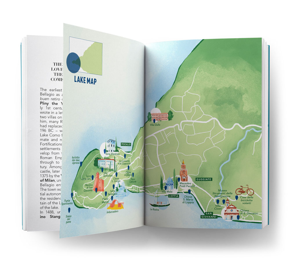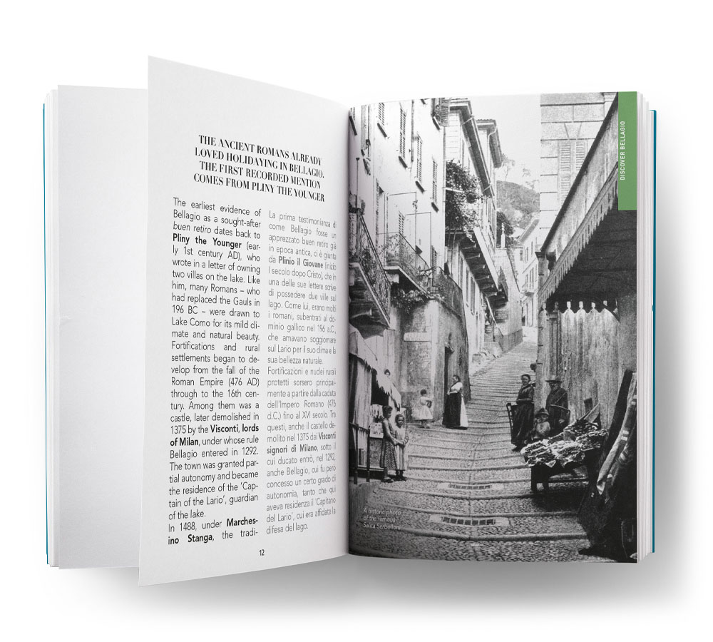 Una preziosa guida di 192 pagine, in doppia lingua (inglese/italiano), formato pocket (11,5x16,5 cm) con rilegatura olandese, che tra testi accattivanti e foto inedite accompagna alla scoperta del magnifico territorio di Bellagio: dalle placide acque del Lago di Como fino a verdi colline e bellissime montagne.