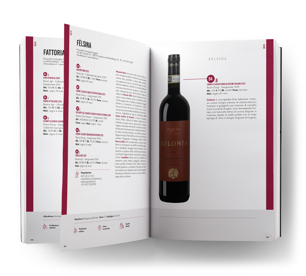 La guida di AIS Toscana dedicata ai migliori produttori vitivinicoli della Regione. Un unicum nel suo genere, dove potrete trovare più di 2.000 vini recensiti e classificati con punteggio numerico e 439 cantine complete di informazioni su ristorazione, accoglienza, wine experience e degustazioni. Un racconto inedito della Toscana e della sua vocazione al vino firmato dai migliori sommelier AIS